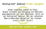 Kristen + Görmann KG: „Die Leistungsfähigkeit der Maschine und die damit verbundene Bandbreite sieht man der Multigrind ® Radical nicht an. Sie ist klein und schnuckelig, ein Wolf im Schafspelz. Die Wechselzeiten sind extrem schnell, auch unabhängig vom Spannmittel. Radical: Der Name ist Programm. Adelbert Haas hat die Hand am Puls der Zeit. Die Multigrind® Radical ist aus einer Vision geboren. Das merkt man gleich.“